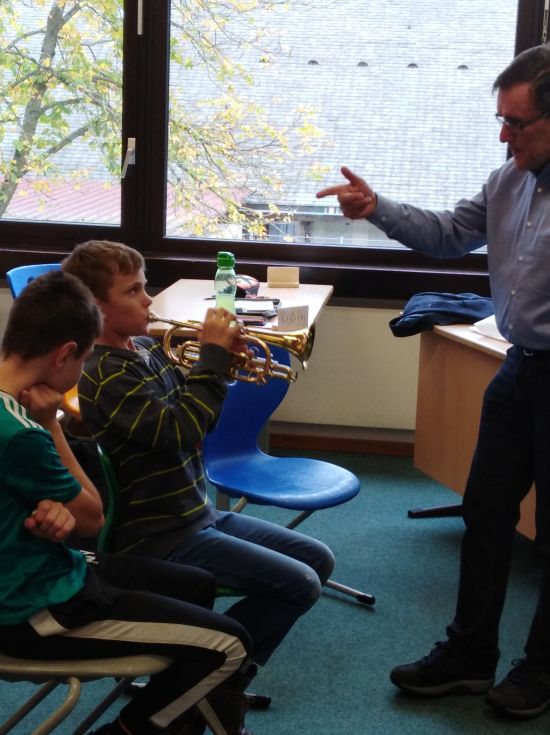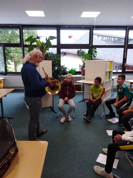 Diese Frage konnten die fünften Klassen hautnah beantworten: Max Joos und sein LehrerInnen –Team kam eigens in unsere Schule, um ihre fünf Blasinstrumente und das Schlagzeug vorzustellen. Alle SchülerInnen waren eingeladen, diese dann in Kleingruppen auszuprobieren. Da trompetete es im Klassenzimmer, im PC-Raum erklang das Schlagzeug und die Querflöte erhellte die kalte Schulküche. Alle waren Feuer und Flamme und nutzten die drei Schulstunden für ungewohnte Töne. Interessierte SchülerInnen erhalten nun Einzelunterricht und können in die Bläserklasse aufgenommen werden.