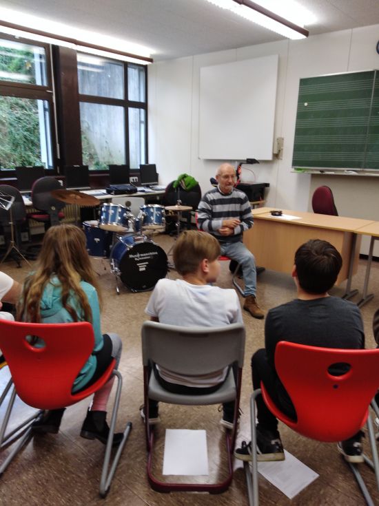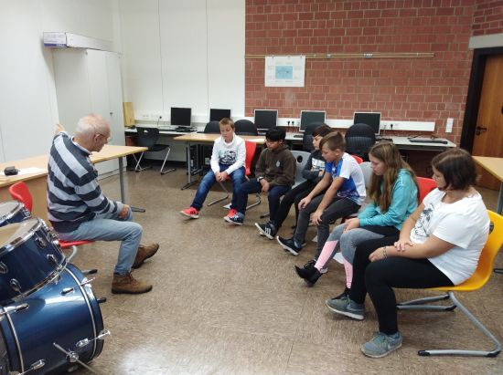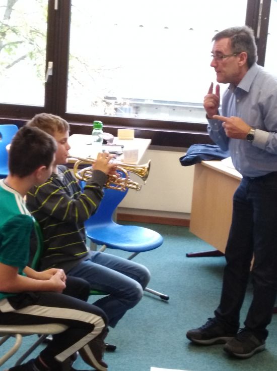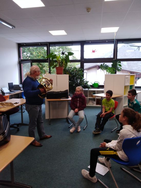 Diese Frage konnten die fünften Klassen hautnah beantworten: Max Joos und sein LehrerInnen –Team kam eigens in unsere Schule, um ihre fünf Blasinstrumente und das Schlagzeug vorzustellen. Alle SchülerInnen waren eingeladen, diese dann in Kleingruppen auszuprobieren. Da trompetete es im Klassenzimmer, im PC-Raum erklang das Schlagzeug und die Querflöte erhellte die kalte Schulküche. Alle waren Feuer und Flamme und nutzten die drei Schulstunden für ungewohnte Töne. Interessierte SchülerInnen erhalten nun Einzelunterricht und können in die Bläserklasse aufgenommen werden.